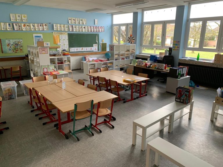 Schülertische und Schülerstühle können nach Bedarf angeordnet werden, d.h. den Arbeitsformen wie z.B. Gruppenarbeit entsprechend. Außerdem sollte die Anordnung des Mobiliars so sein, dass die Kinder noch die Möglichkeit haben sich im Raum zu bewegen.